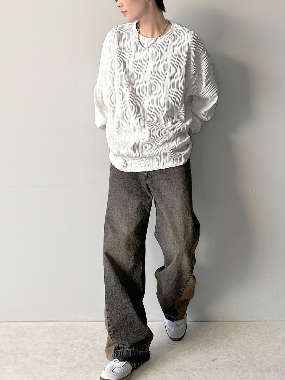 classicalelfクラシカルエルフ(Classical Elf ZOZOTOWN)のTシャツ/カットソー「ゆるさとスタイリッシュを両立。オーバーサイズウェーブ柄ジャガード長袖Tシャツ」を使ったコーディネート