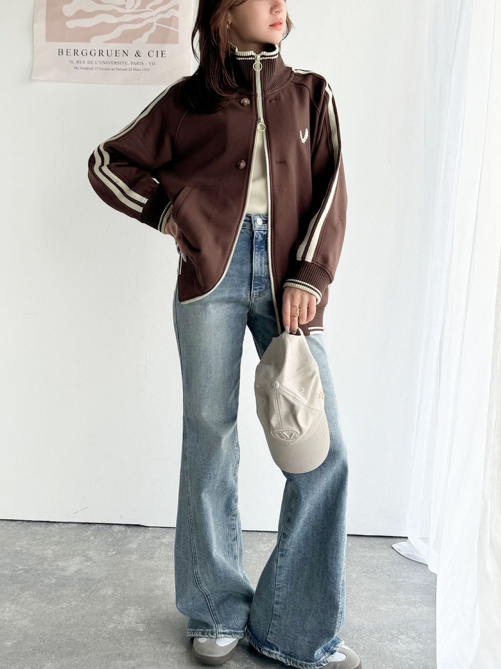 classicalelfクラシカルエルフのブルゾン「【mily bilet】配色スタンドネックがスポーティー。フロントボタン2way胸刺繍サイドレースダブルジップアップブルゾン」を使ったコーディネート