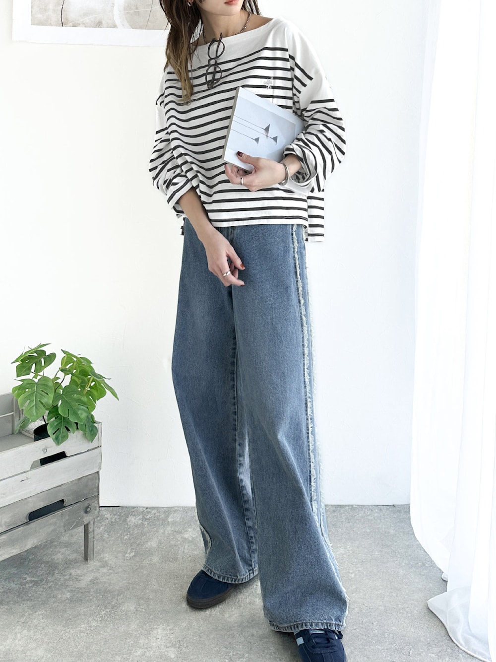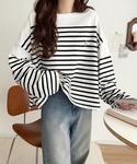 classicalelfクラシカルエルフのTシャツ/カットソー「快適な着心地と洗練されたデザインが魅力。ボートネックオーガニックコットン100%パネルボーダーTシャツ(長袖)」を使ったコーディネート