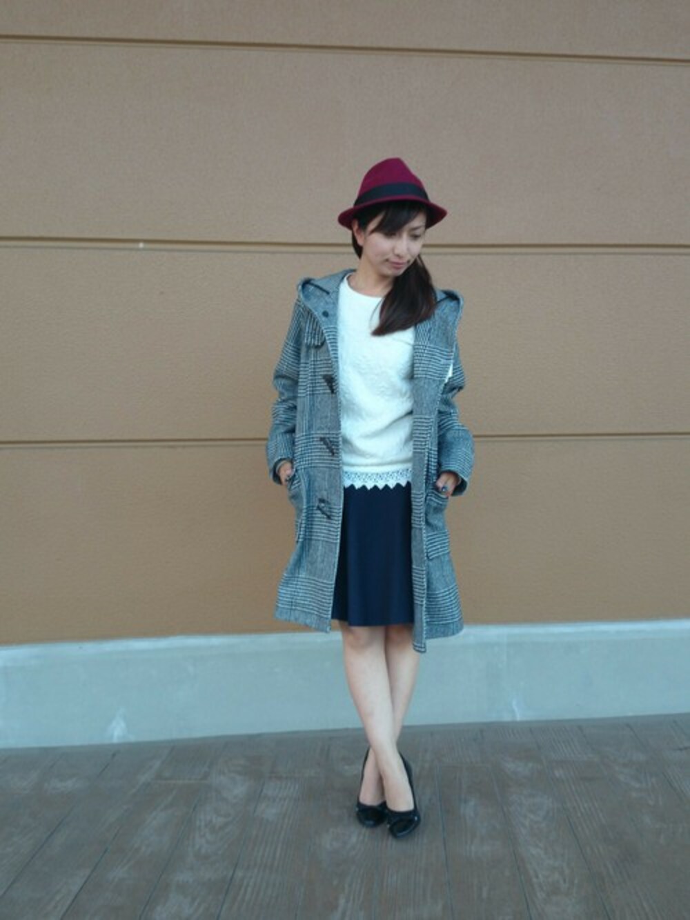 チェックのダッフルはとにかく可愛いですよ!今回は全体的に可愛くコーデ。ニット×シャツ×パンツスタイルにしても素敵に仕上がりますよ☆