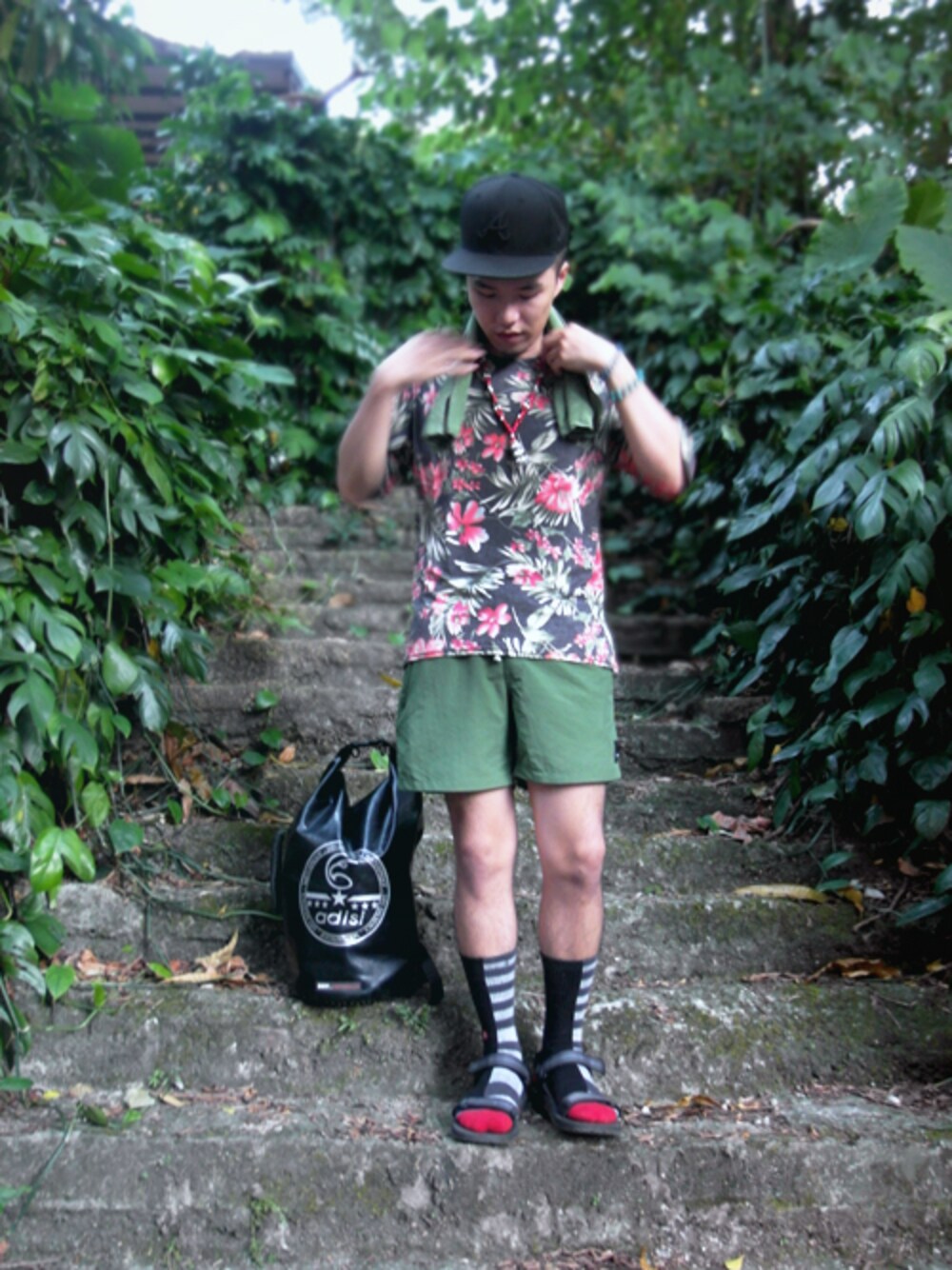 去爬山 以綠紅黑來穿搭