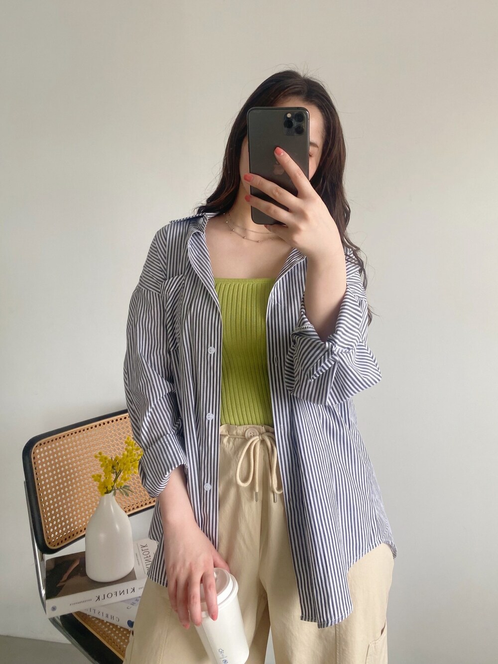 ストライプシャツにカーゴパンツで メンズライクな春コーデ♡ インナーのグリーンキャミもアクセントに◎ Instagram▷@clea_official_store