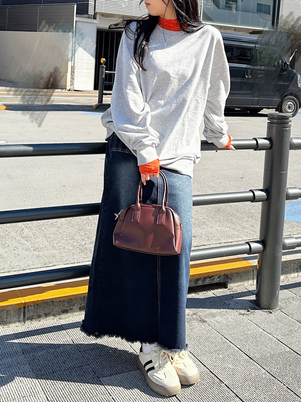 いつものコーデにプラスワン!インナーにオレンジのメロウシアーハイネックを合わせてアクセントに🍊 model:160cm/骨格ウェーブ instagram▷ un_frame_official clea_official_store