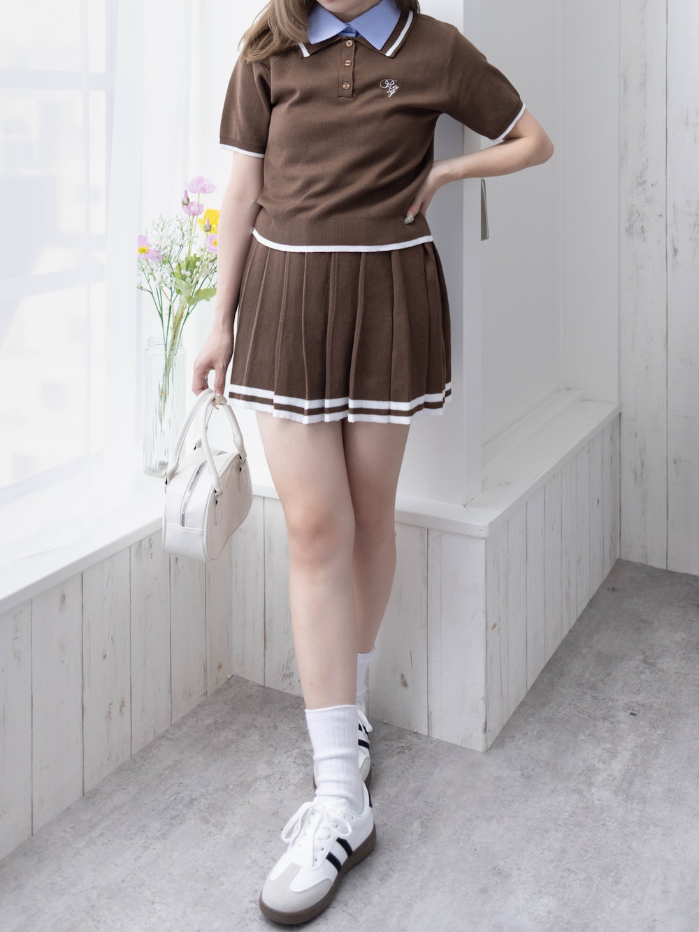 clear ももこ(clear)のワンピース「ダブルカラーポロニット&スカートセットアップ[韓国 カジュアル ガーリー]」を使ったコーディネート