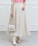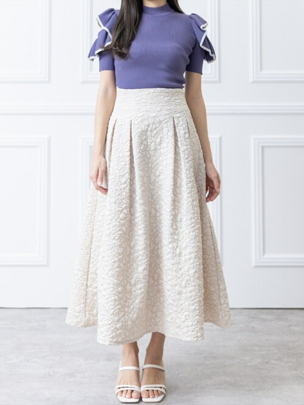 肩を露出したデザインが特徴的のオープンショルダーフリルニットトップスと 立体感のある素材感が魅力的のブークレスカートのコーディネートは、 セクシーでモードな印象を与えてくれます。