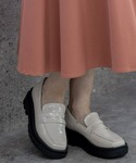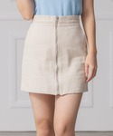 シアードットブラウスとフロントジップデニムミニスカート、そしてエナメルローファーを組み合わせで、カジュアルの中にもきちんと感のあるコーディネートが完成。