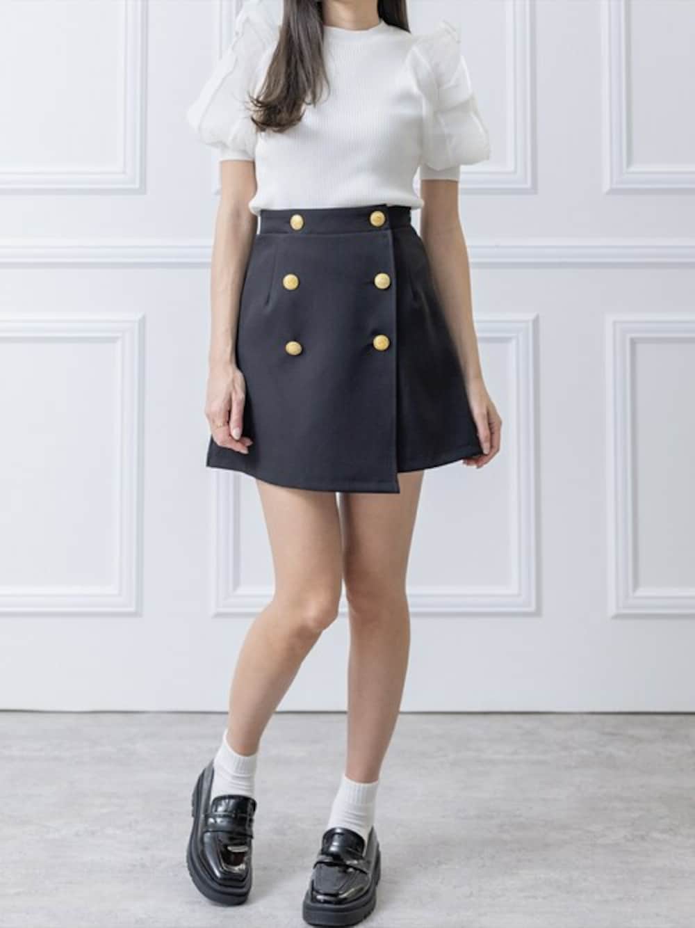 パフスリーブとスカートのラップデザインが女性らしい印象に。 ホワイトとブラックでシックな印象を与え、エナメルローファーが全体の上品さを引き立てます。 今回はローファーで大人っぽく仕上げましたが、ヒールと合わせてより華やかに仕上げるのもおすすめ。 トップスのパフスリーブニットは、布帛素材と編み地が切り替えられたデザインが特徴的。 スカートはフロントボタンのラップスカートで、インナーパンツが付いているので安心ですよ♪
