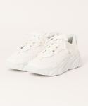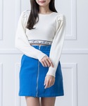 トップスをホワイトで明るく爽やかな印象のスクエアネック裾ロゴニットに、ボトムスをブルーのスカートでメリハリをつけました。 また、スニーカーで足元をカジュアルに仕上げることで、スタイリッシュで快適な着こなしに。