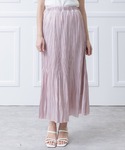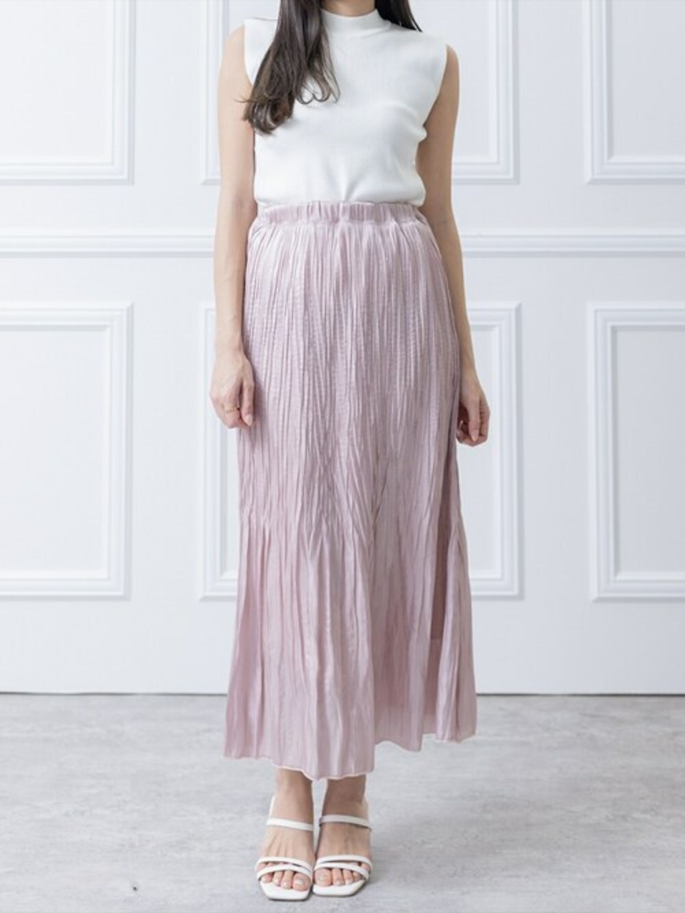 このコーディネートは、オフホワイトのノースリーブニットトップスとピンクのシャイニープリーツスカートを組み合わせた、 フェミニンで華やかな印象のスタイルです。