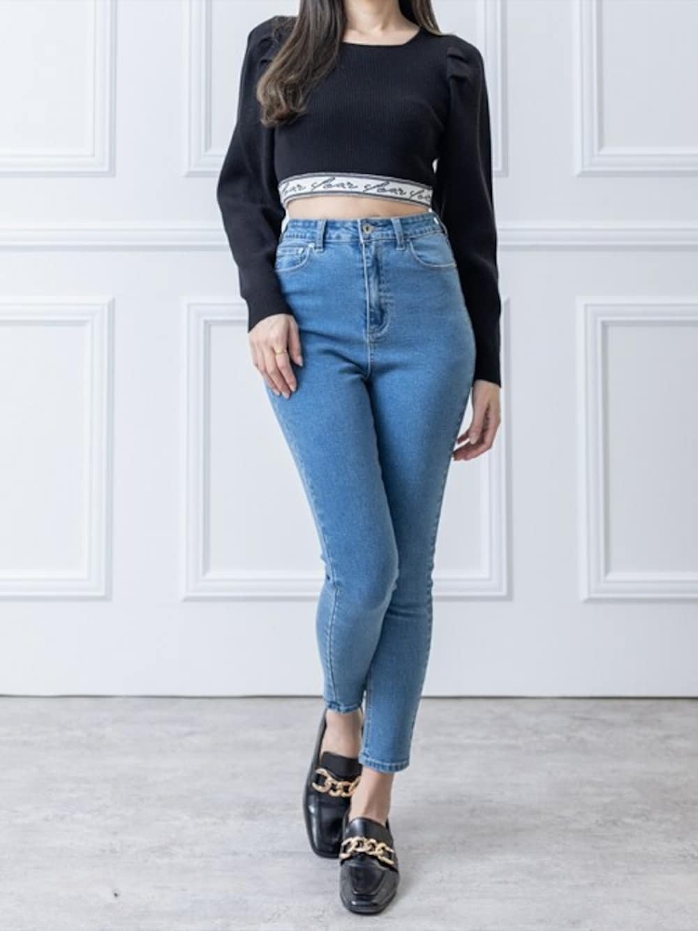 スクエアネックで裾にロゴがデザインされたショート丈のニットトップスと、ブルーのスキニーデニムパンツを組み合わせた、シンプルで洗練された印象のスタイルです。 トップスはショート丈とネックラインがトレンド感を演出し、スキニーデニムと合わせることで、すっきりとしたシルエットになります。 足元は、スニーカーなどのカジュアルな靴でもよいですし、ヒールを合わせてよりきれいめな印象に仕上げることもできます。 今回はパンプスでコーデしてみました。