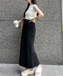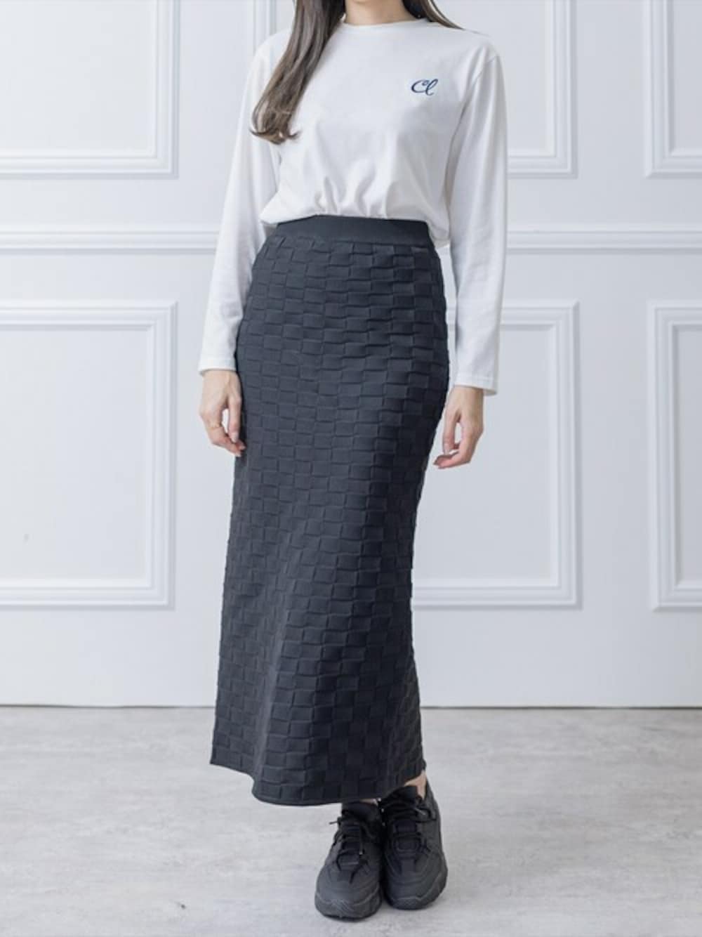 白色の刺繍が施されたロングスリーブTシャツと、エンボス加工が施されたブラックのニットタイトスカートを組み合わせ 、ダッドスニーカーを足元に合わせた、カジュアルな中にもちょっとしたおしゃれ感が漂うスタイルです。 トップスの白色とスカートの黒色が引き立ち、刺繍とエンボス加工をアクセントになっています。