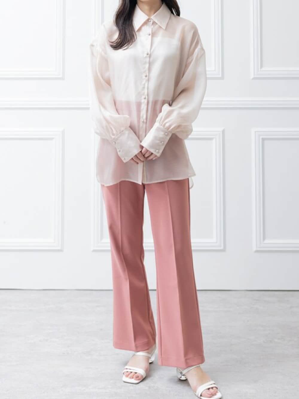 長袖シアーシャツとストレッチカラーセミフレアパンツのコーディネートは、 きれいめカジュアルスタイルやオフィスカジュアルスタイルにぴったりです。