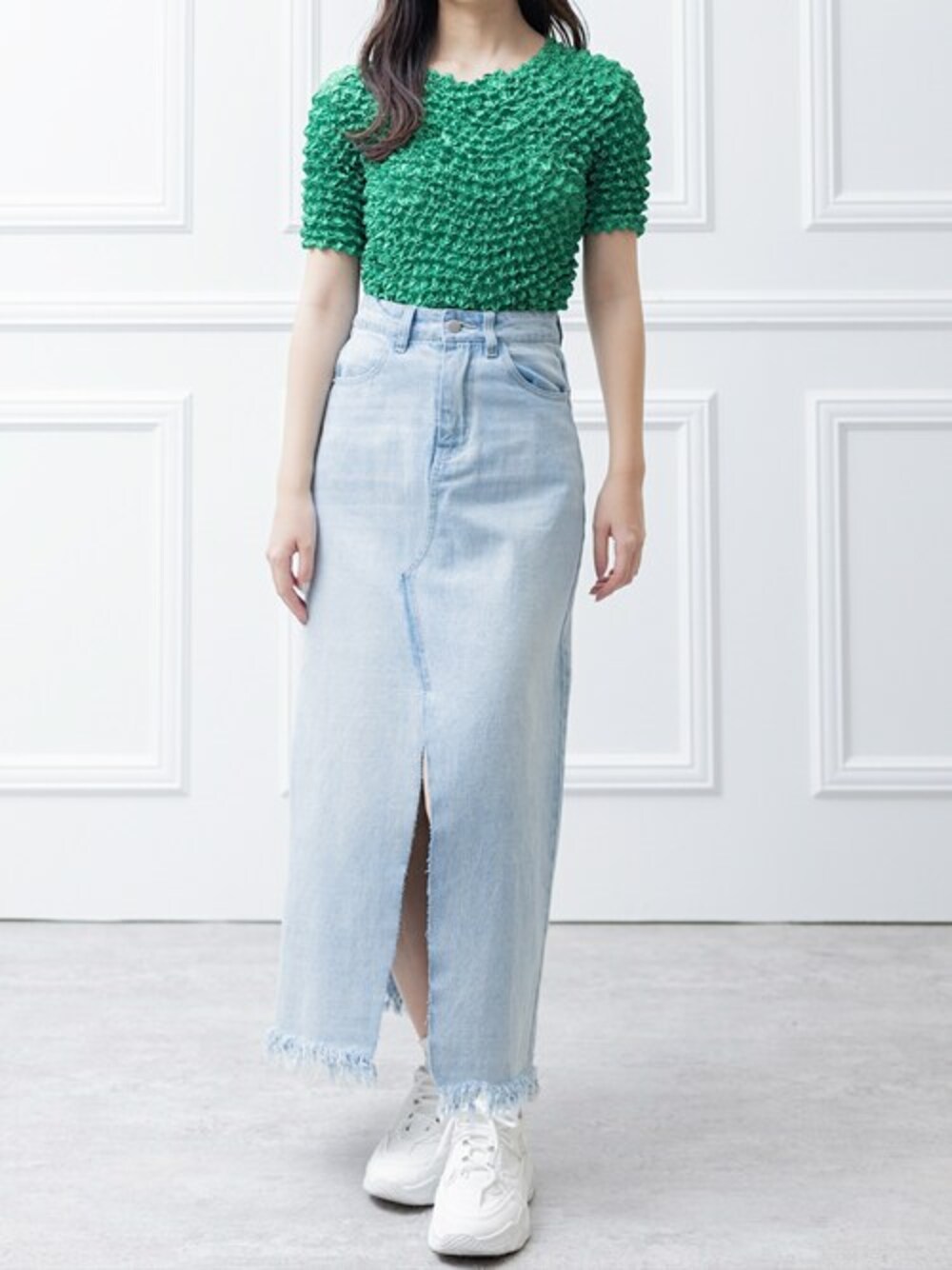 ポップコーン半袖トップスは、伸縮性がとてもある着心地よい素材です。 リメイク風フリンジデニムロングスカートと合わせると、大胆で遊び心のあるコーディネートになります。 ダッドスニーカーを足元にあわせて、よりトレンド感のあるスタイリングに仕上がります。