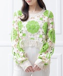 配色クロシェ編みニットトップスとストレッチカラーセミフレアパンツを組み合わせたコーディネートは、 ナチュラルで優しい印象を与えます。