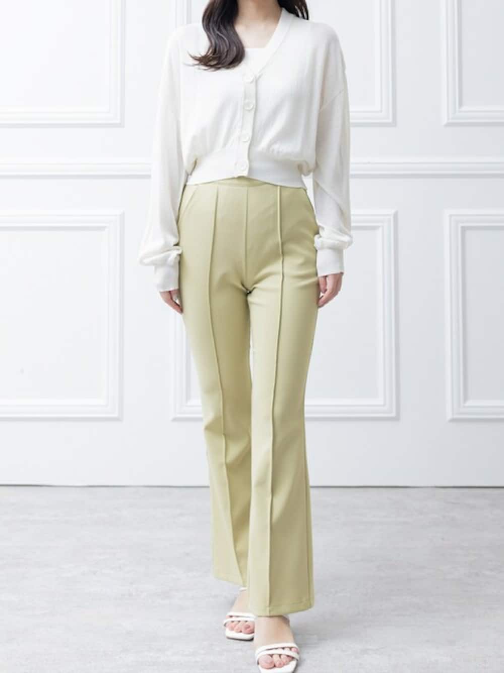 ウエストリボン6分袖ストライプブラウスとストレッチスリムカラーテーパードパンツを組み合わせたコーディネートは、 爽やかできちんと感のあるスタイルです。