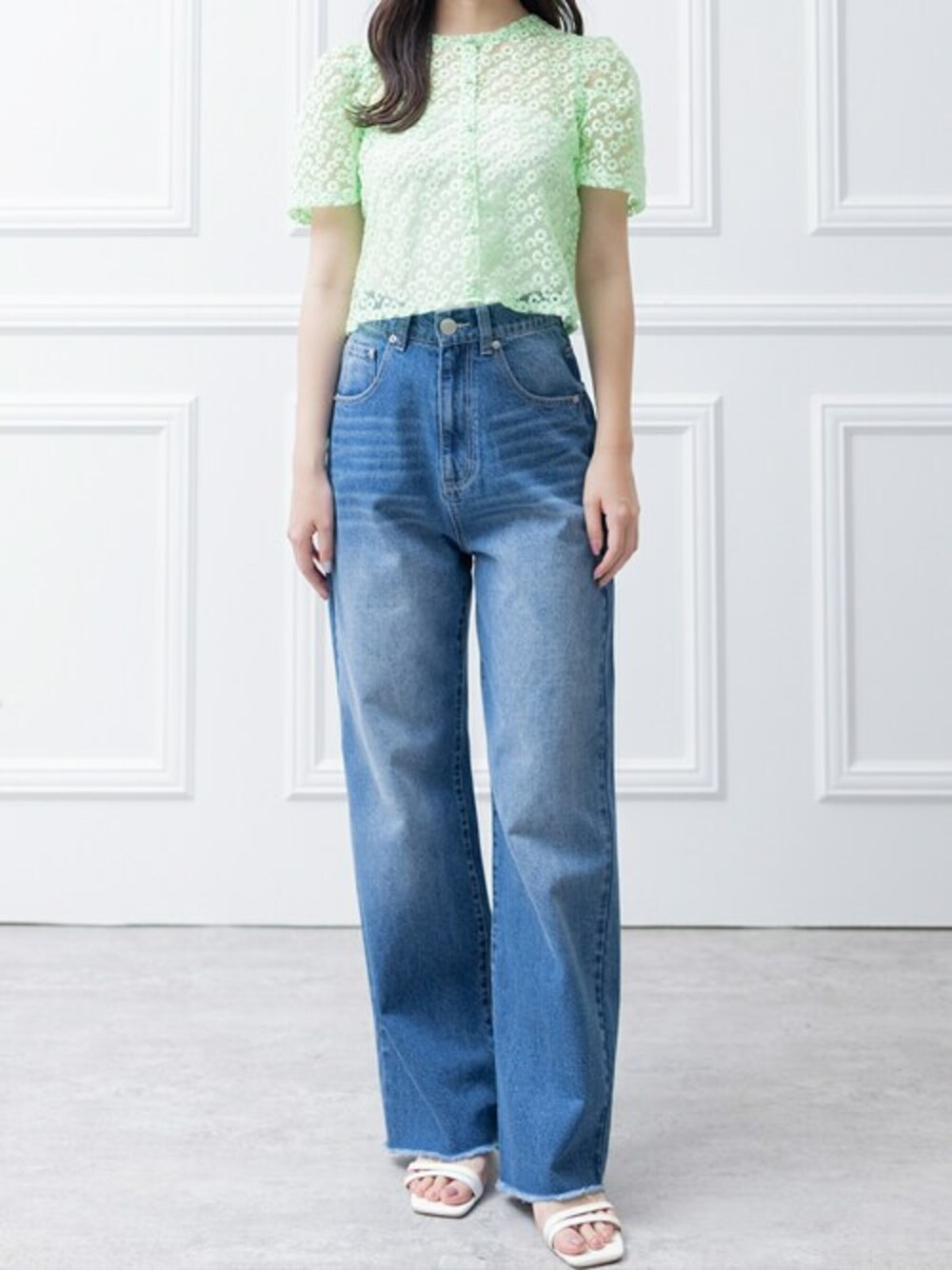 オーガンジー刺繍半袖ブラウスとカットオフフレアデニムパンツのコーディネートは、 エレガントでフェミニンな印象を与えつつも、カジュアルさも併せ持ったコーディネートです。