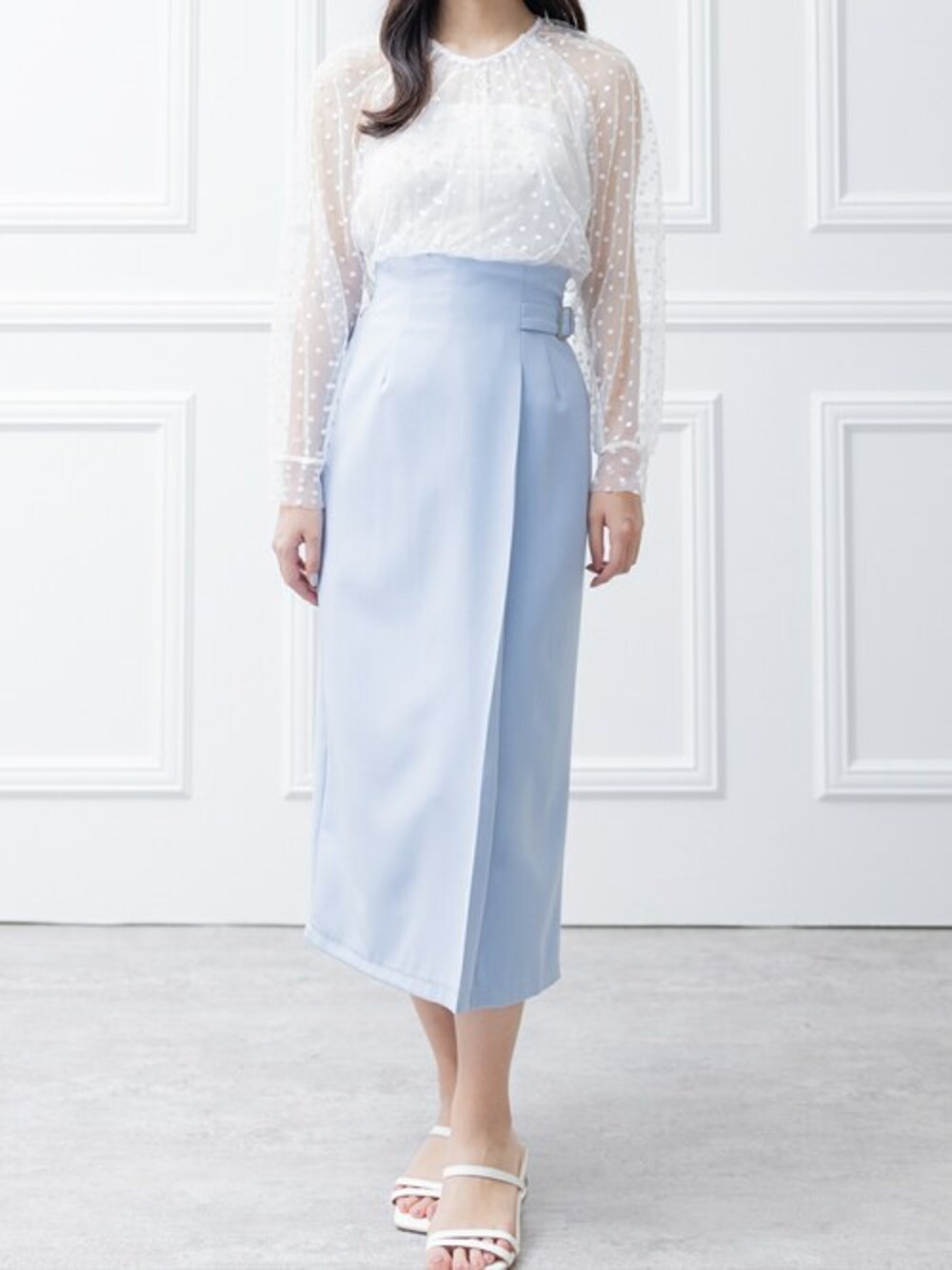シアードットブラウスとウエストベルトタイトスカートのコーディネートは、エレガントでフェミニンな雰囲気のコーデになります。