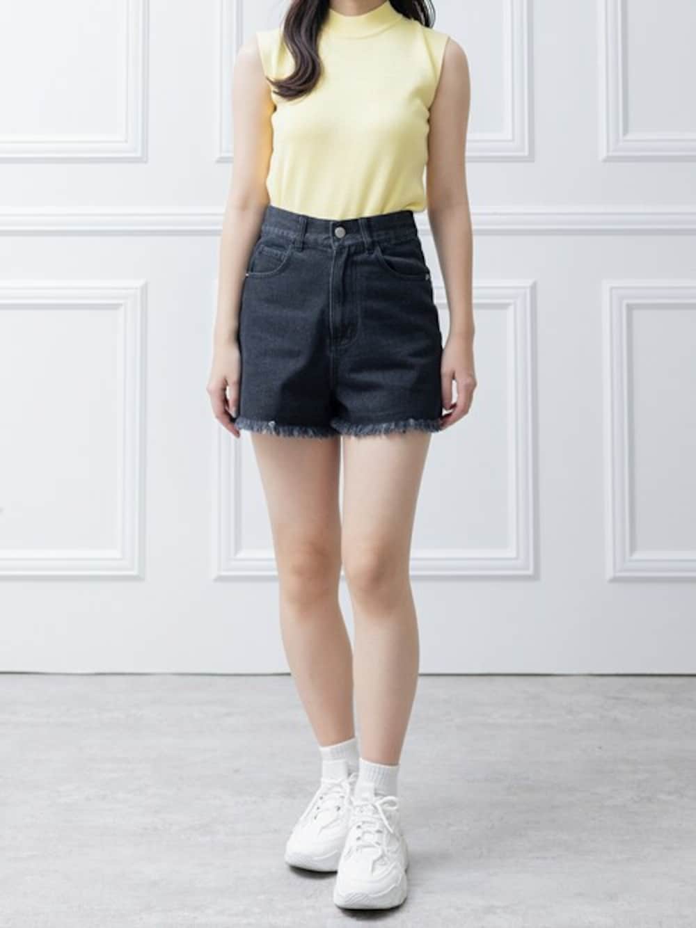 ノースリーブニットトップスとデニムフリンジショートパンツにダッドスニーカーのコーディネートは、 カジュアルな雰囲気を楽しめる夏のスタイリングにぴったりのコーデになります。