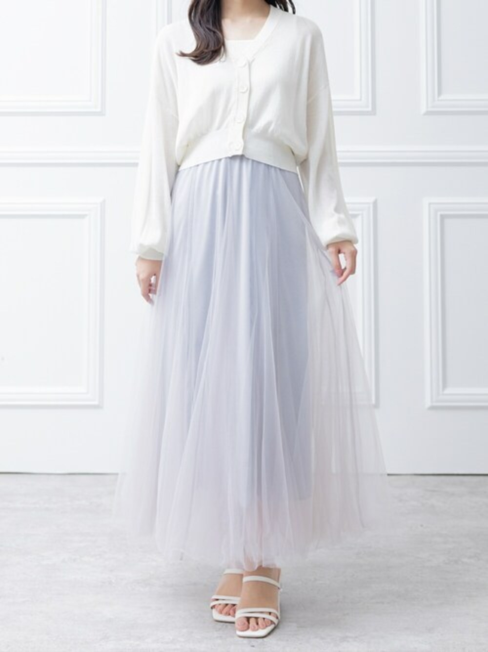 チュールフレアスカートとVネックシアーニットカーディガンのコーディネートで、 エレガントで華やかな雰囲気を演出しつつ、女性らしさも強調できるコーディネートになります。