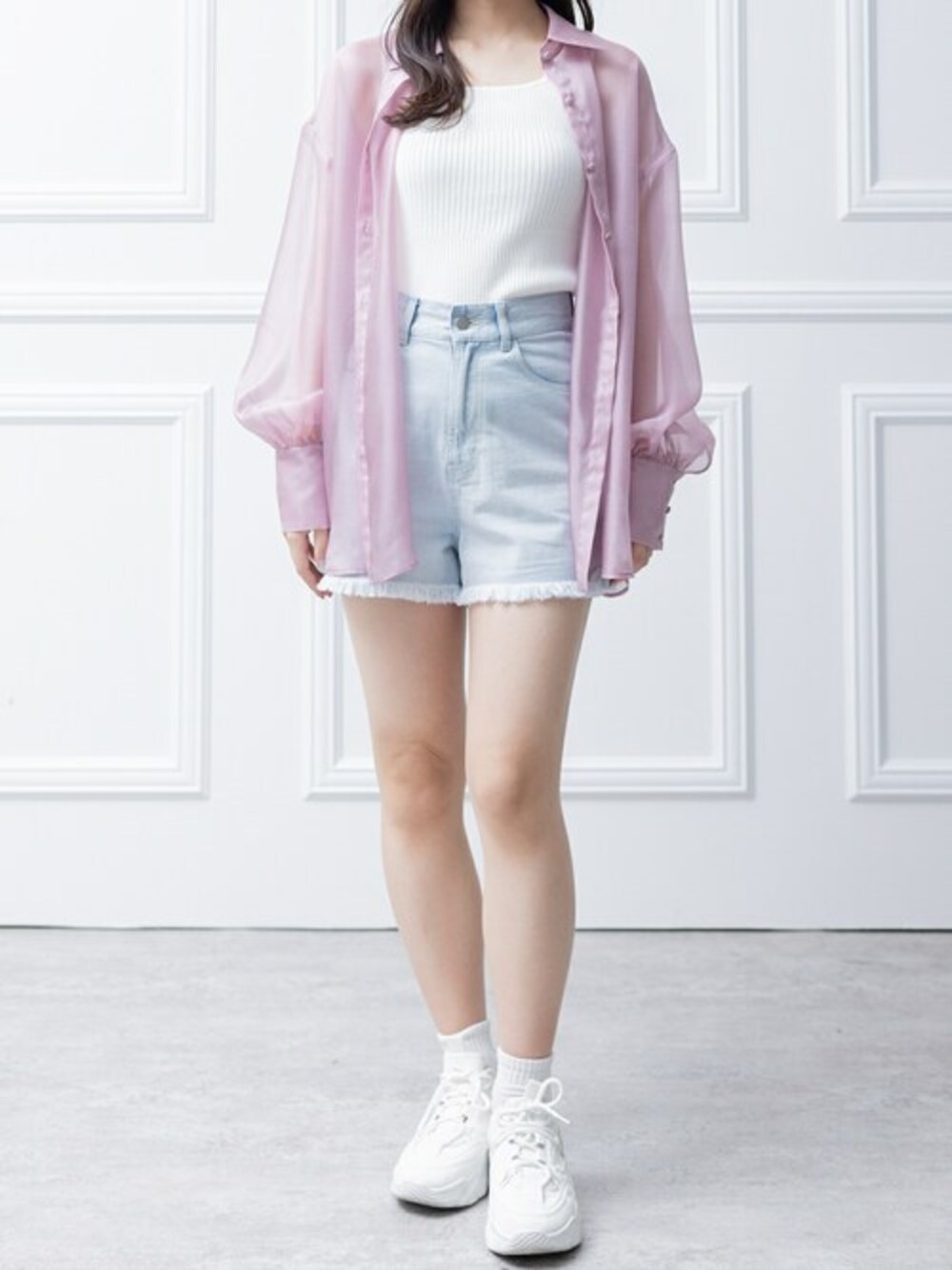 長袖シアーシャツとデニムフリンジショートパンツ、そしてダッドスニーカーという組み合わせで トレンド感のあるカジュアルスタイルを演出することができます。