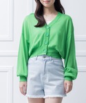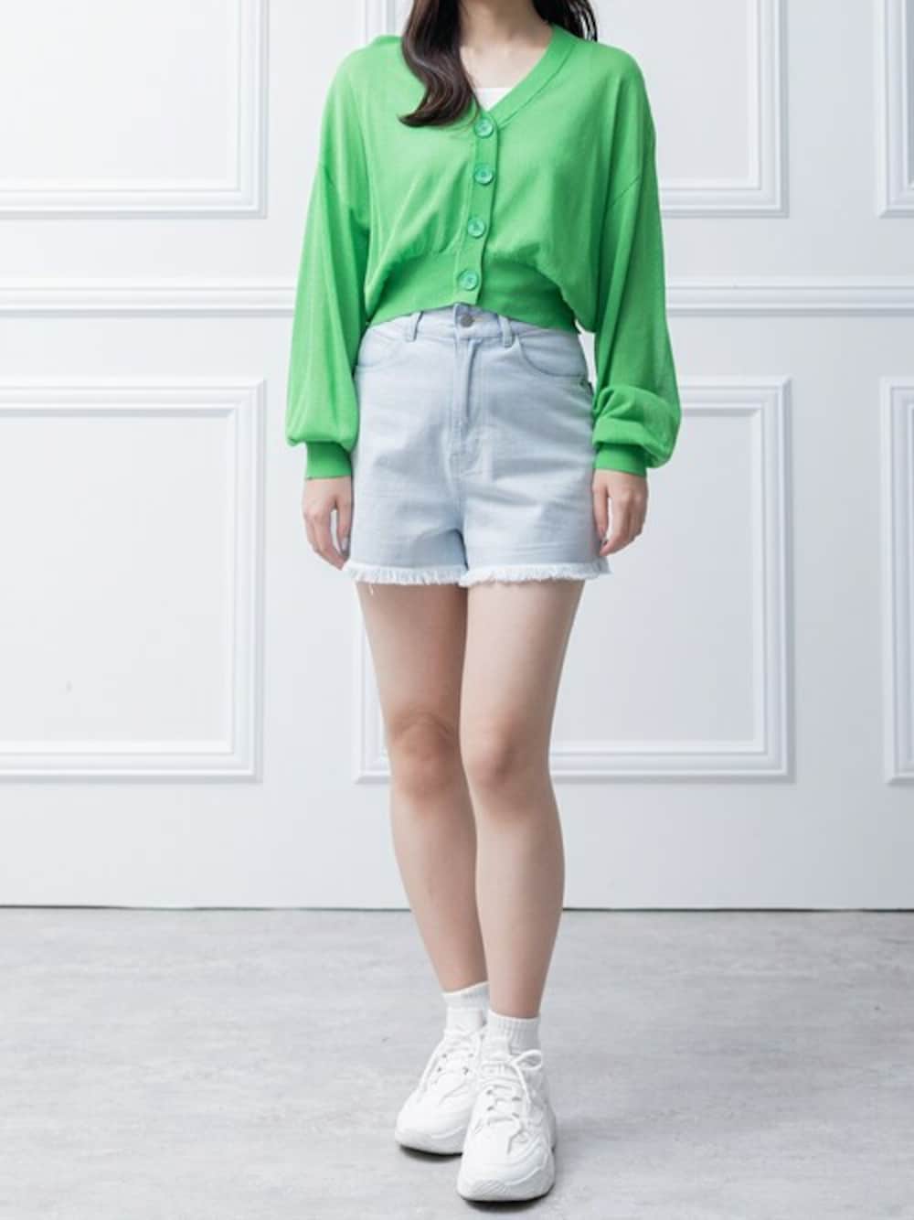 鮮やかなグリーンのカーディガンと裾がフリンジになった遊び心プラスしたデニムショートパンツをあわせました。 カジュアルなコーデにシアー素材で女性らしいエレガントさをプラスしたコーデになります。