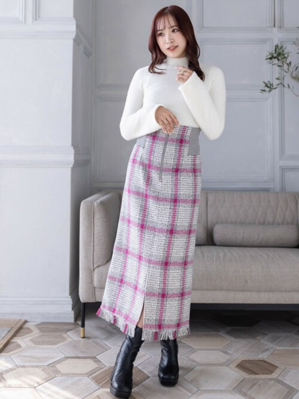 チェック柄がコーディネートのアクセントになって可愛らしいです! フロントジップでウエストゴムになっているので、着やせ効果も抜群です◎ 生地感もしっかりと暖かみがあるのでこれからの季節にもぴったりなアイテムです♪