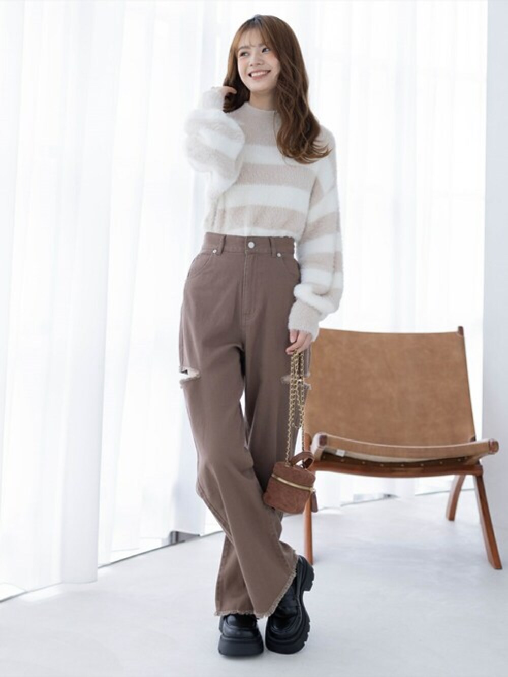 つい触りたくなるようなふわふわとしたフェザーニット。 ハイネックなので寒い冬にも最適のアイテムです! また、シルエットを拾わないのでどんなアイテムにも合わせやすいです!