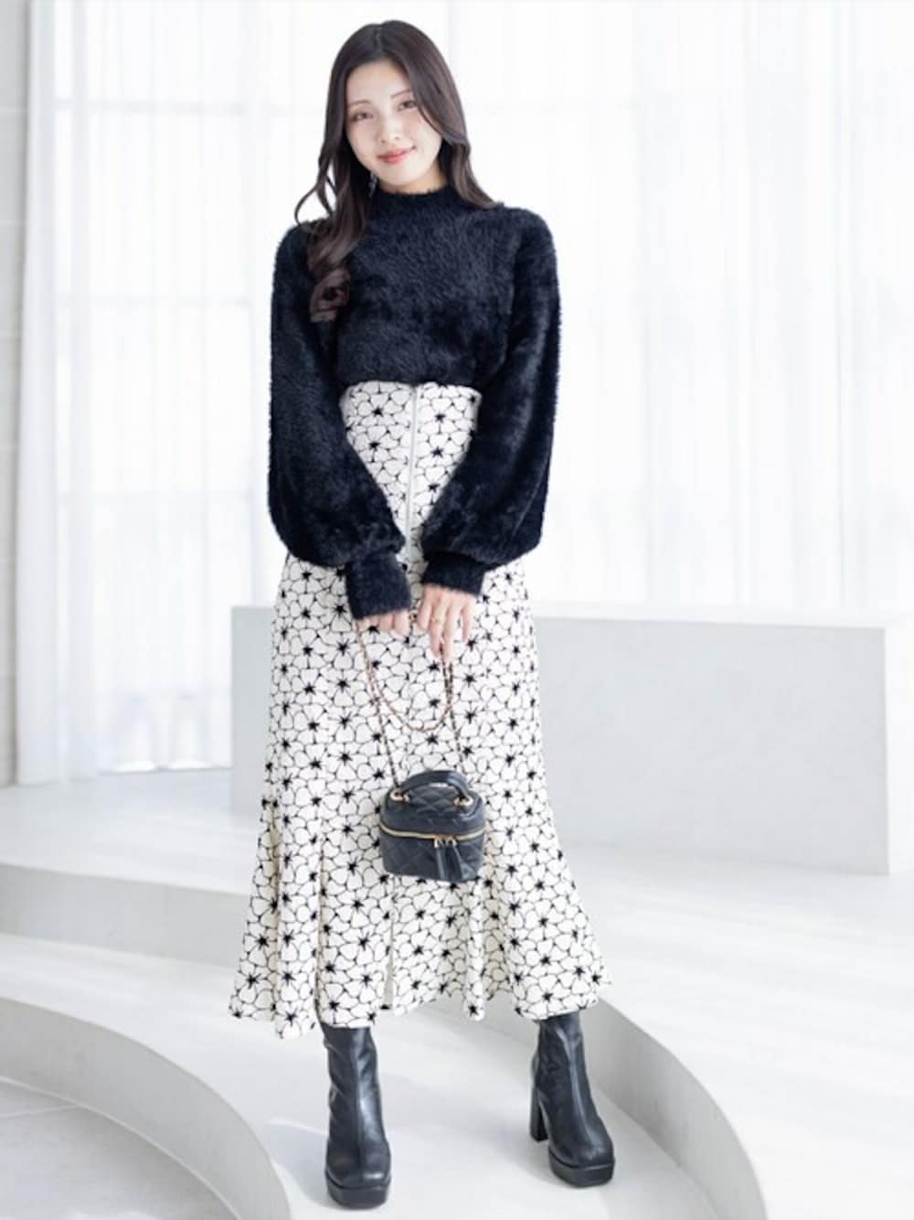 つい触りたくなるようなふわふわとしたフェザーニット。ハイネックなので寒い冬にも最適のアイテムです!また、シルエットを拾わないのでどんなアイテムにも合わせやすいです!