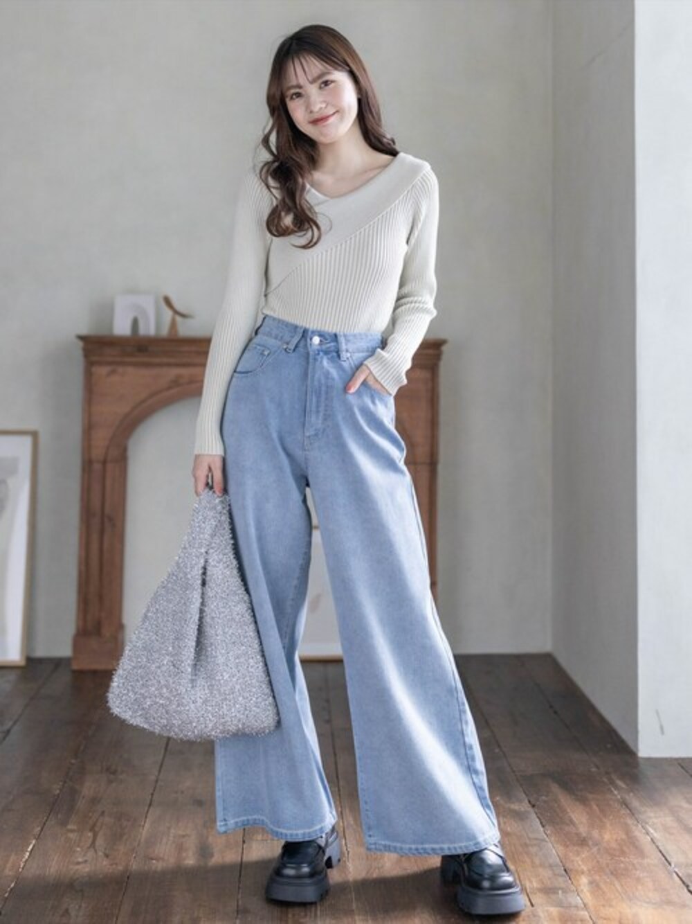 シンプルなデザインとアシンメトリーなVネックがモードな印象を抱かせてくれる長袖ニットトップス。ボディラインにピッタリとフィットし女性らしさも高まりやすいので、レディライクなコーデが好きな方には特にオススメなアイテムです。