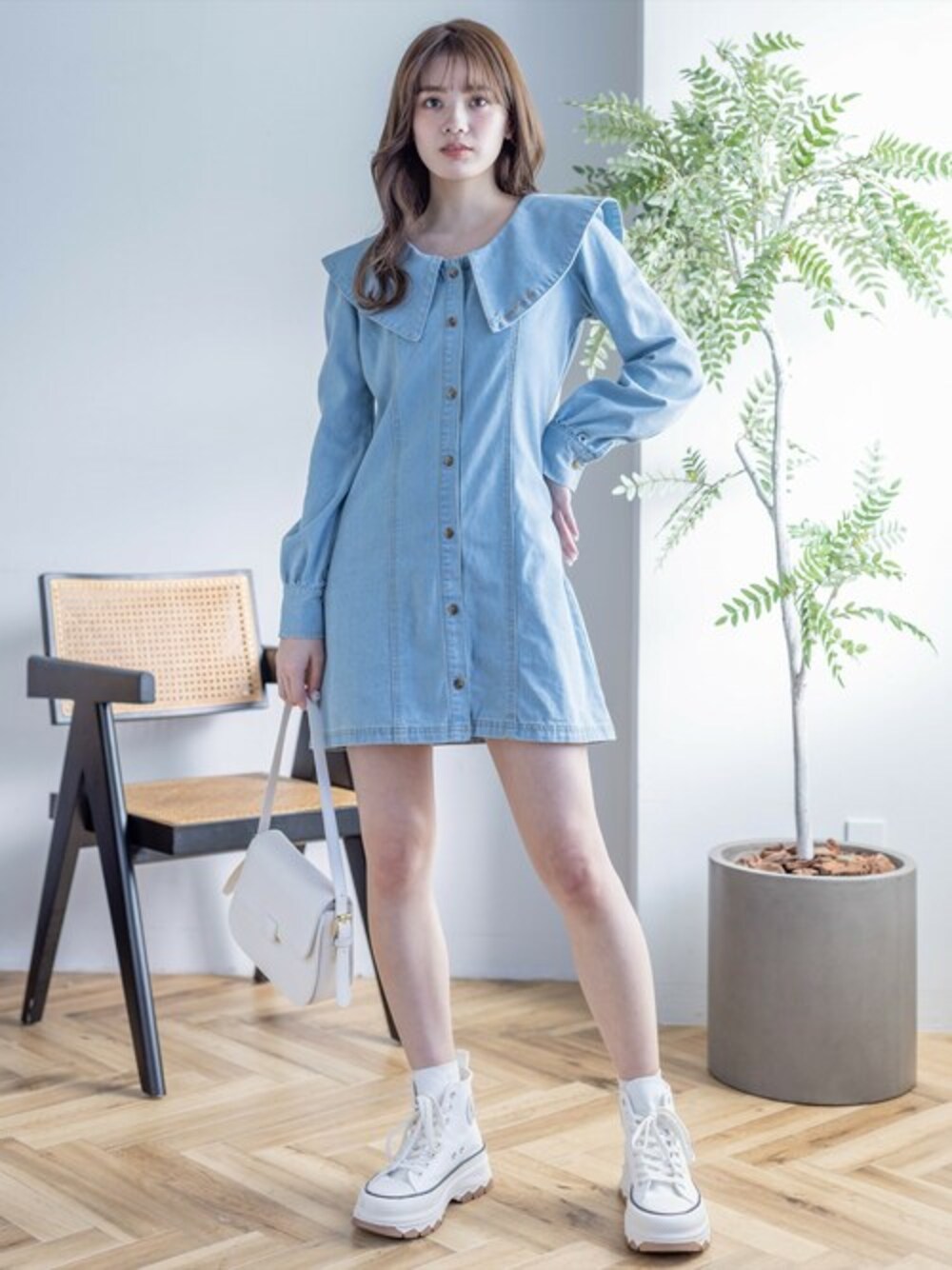 clear(クリア)(clear)のワンピース「刺繍入りビックカラーデニムミニワンピース≪2024SS新作≫」を使ったコーディネート