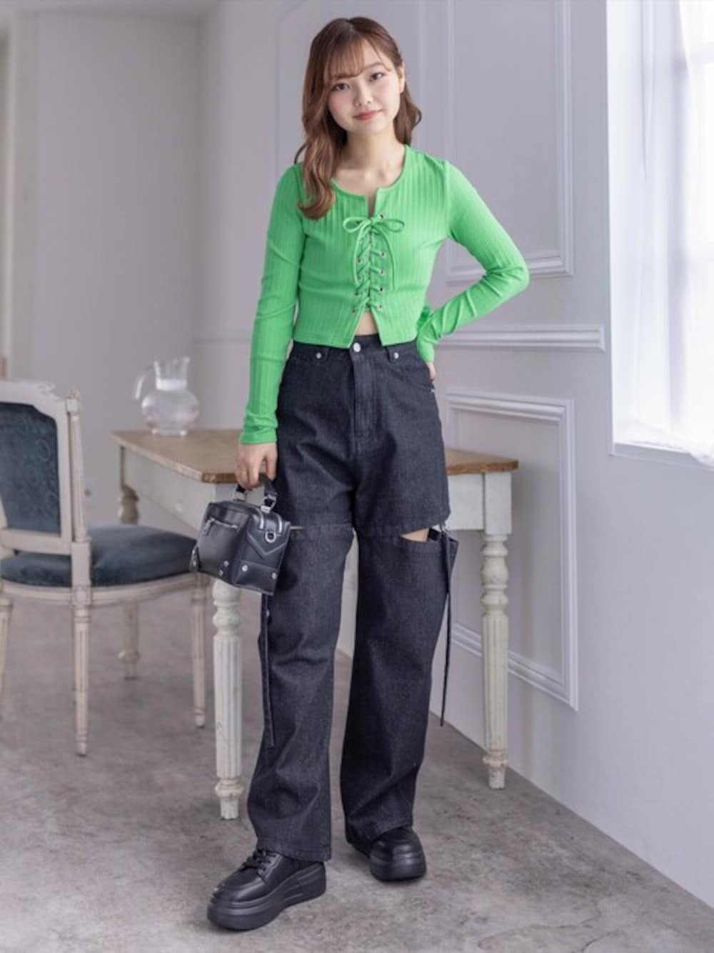 フロントのレースアップのデザインが女性らしく可愛いです!顔周りがすっきりするのと、お腹もチラっと肌見せでヘルシーな肌見せコーデができます。