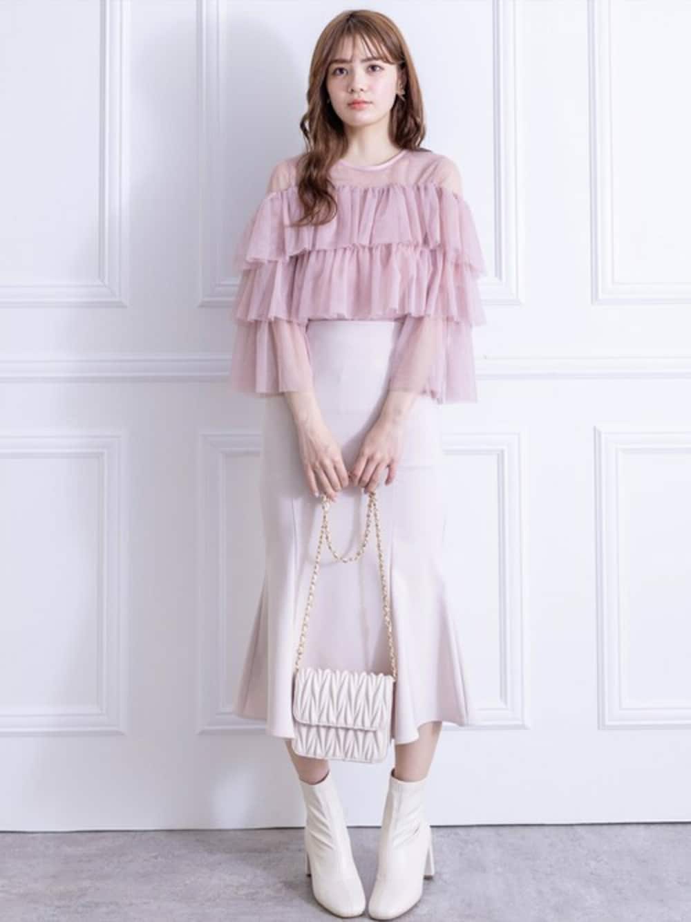 今季もトレンドのチュールがついたトップス。さりげなく二の腕もカバーし、ボディの透け感はないので安心して着ていただけます!コーディネートを華やかにしてくれるアイテムになります。