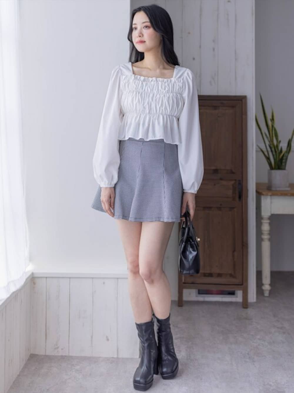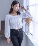 存在感のあるシャーリングがすっきりとした印象を与えてくれます!ショート丈にスクエアネックなので抜け感のあるシルエットがきれいです!