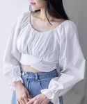 トレンドのショート丈ブラウスでサイズ感もコンパクトなので、どんなボトムス合わせでもきれいに見せてくれます。後ろでリボンに括っていただけるデザインなので、前後どちらから見ても可愛いです♪