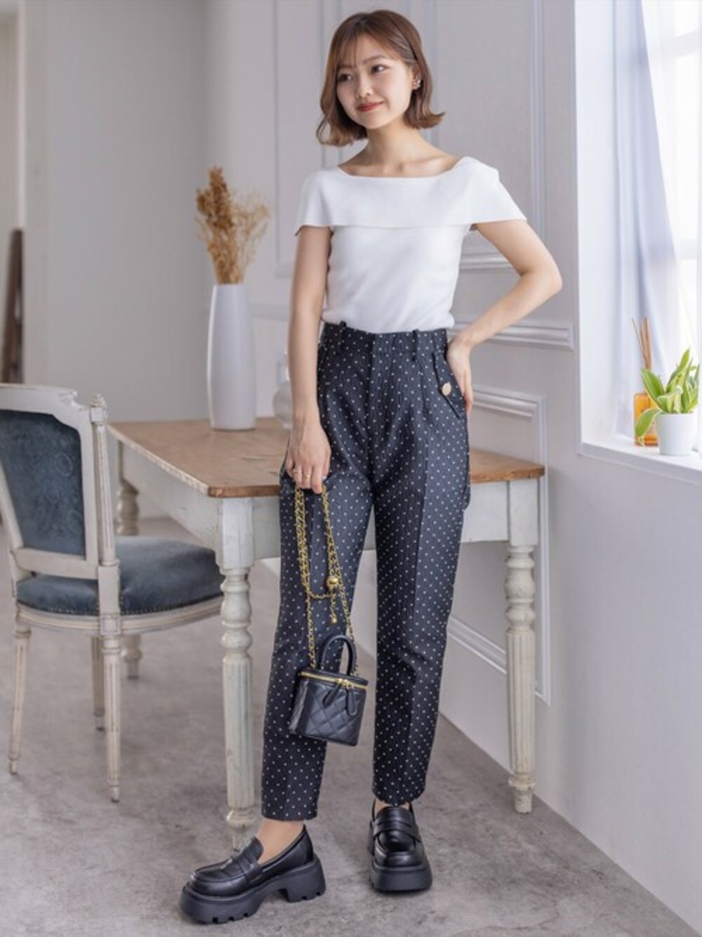 clear(クリア)(clear)のスラックス「ドット柄ストレッチテーパードパンツ[低身長用サイズ有]」を使ったコーディネート