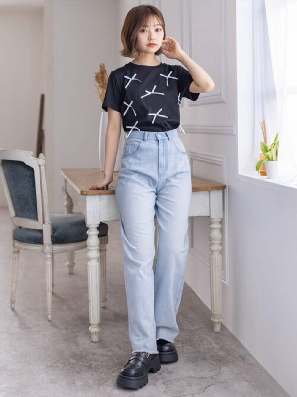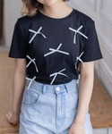 シンプルなTシャツにトレンドのリボンが散りばめられた可愛らしいトップス。リボンの大きさも程よくコーディネートのポイントになります♪袖感も長めなので、二の腕をカバーしスタイルアップ効果も抜群です◎