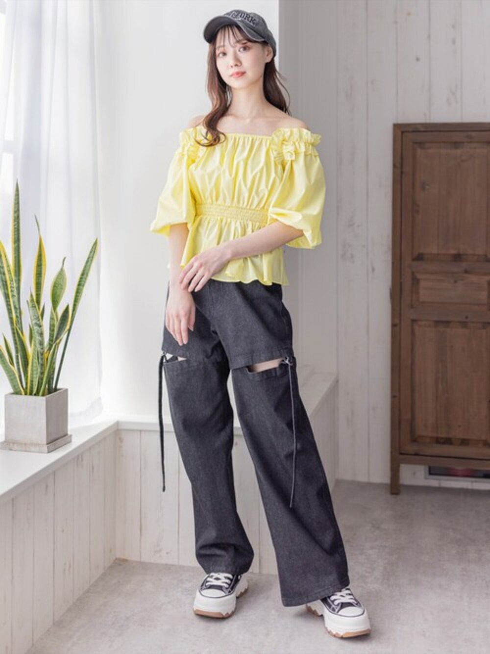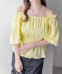 そのままでもオフショルでも着回しが可能です♪肩フリルで可愛らしさを演出し、顔回りが華やかになります!ウエスト部分にシャーリングのデザインがあるので、スタイルアップ間違いなしです◎