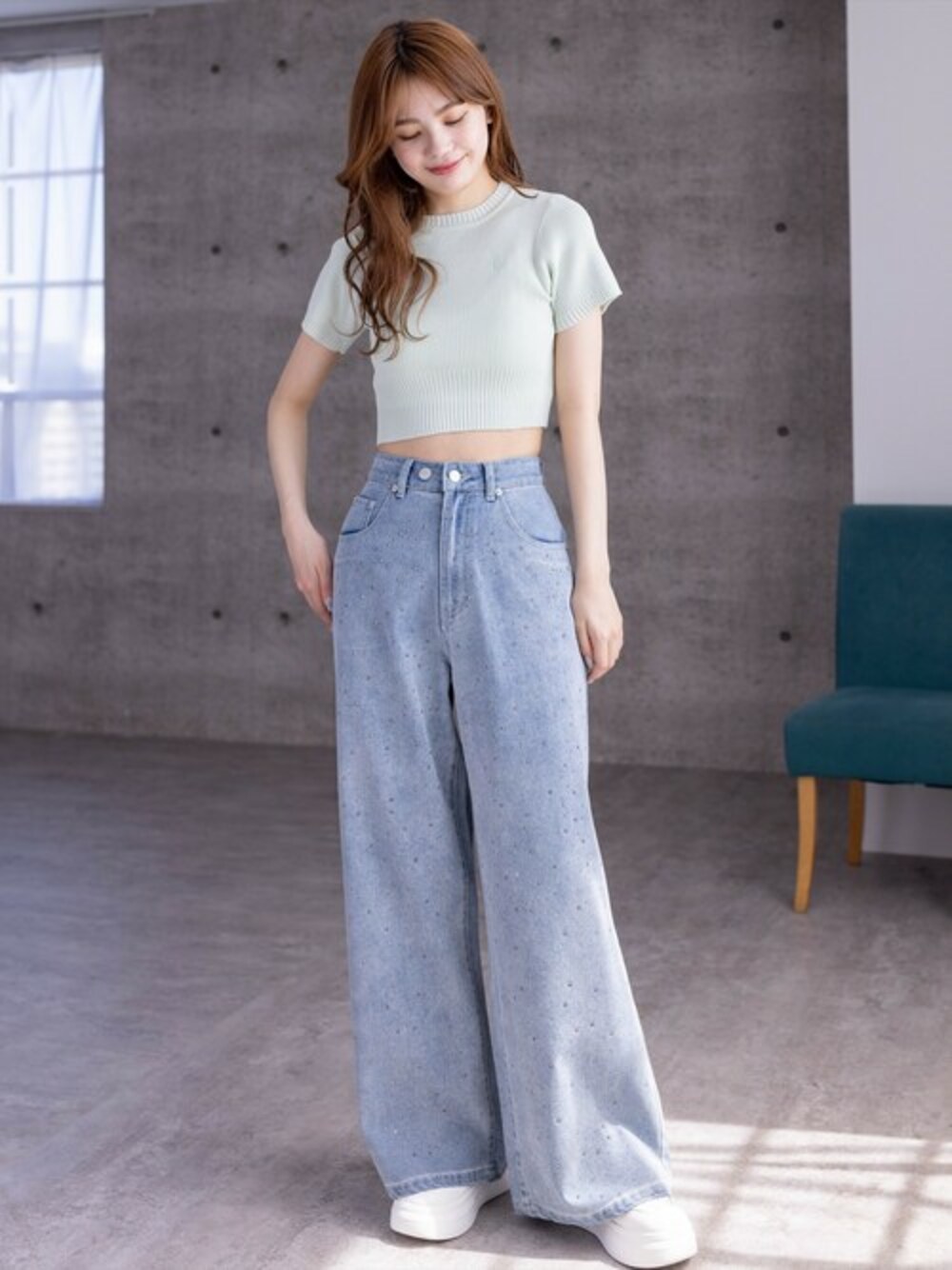 clear(クリア)(clear)のニット/セーター「ワンポイント刺繍半袖ショート丈ニットトップス[オフィスカジュアル 着回し抜群 大人 カジュアル] ≪2024AW新作≫」を使ったコーディネート