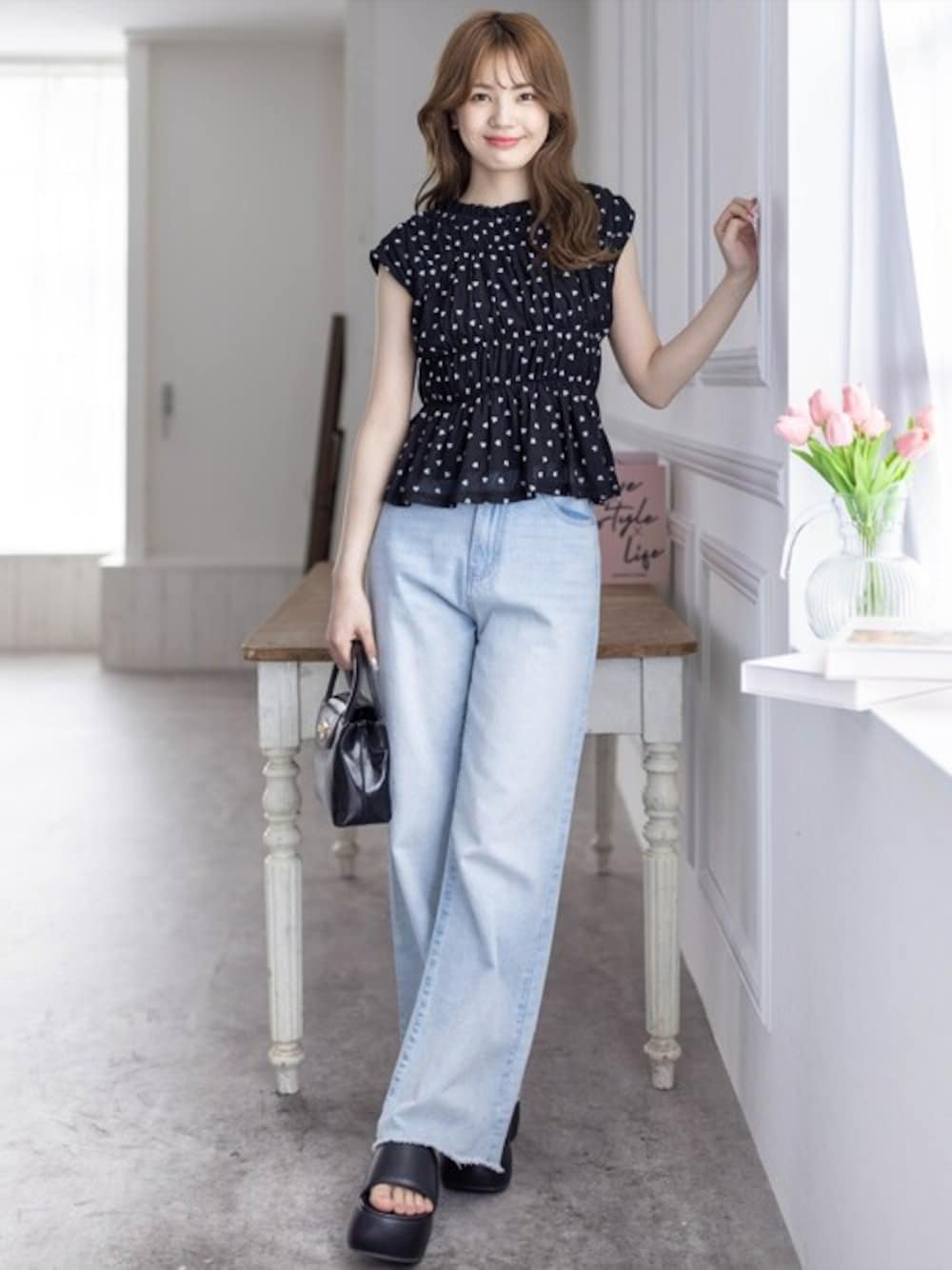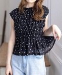 トレンド感のあるハート柄のブラウスです。ノースリーブのデザインで、ハート柄でも大人っぽい印象になります!バックリボンなので、後ろ姿まで映えます♪