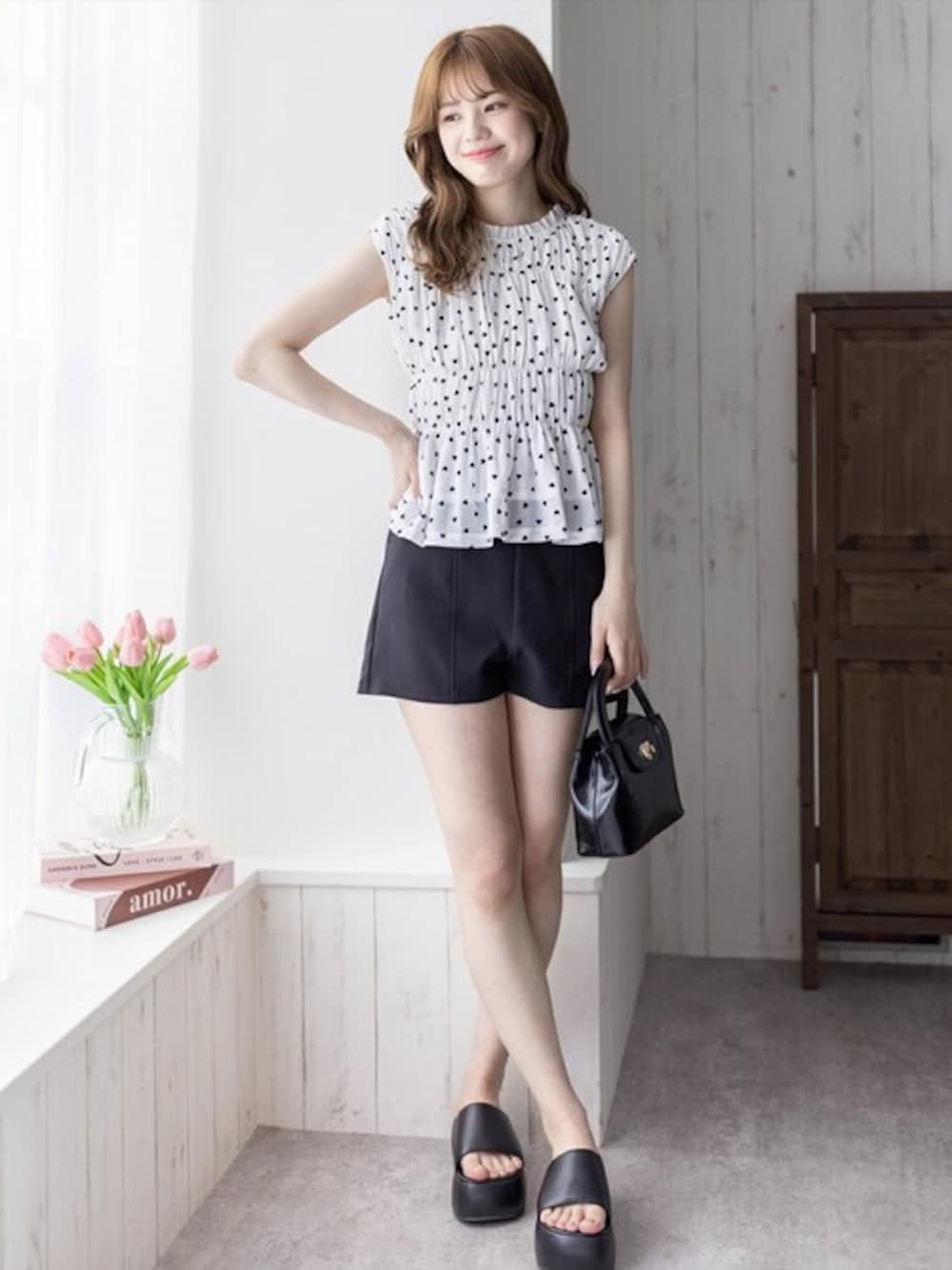 トレンド感のあるハート柄のブラウスです。ノースリーブのデザインで、ハート柄でも大人っぽい印象になります!バックリボンなので、後ろ姿まで映えます♪