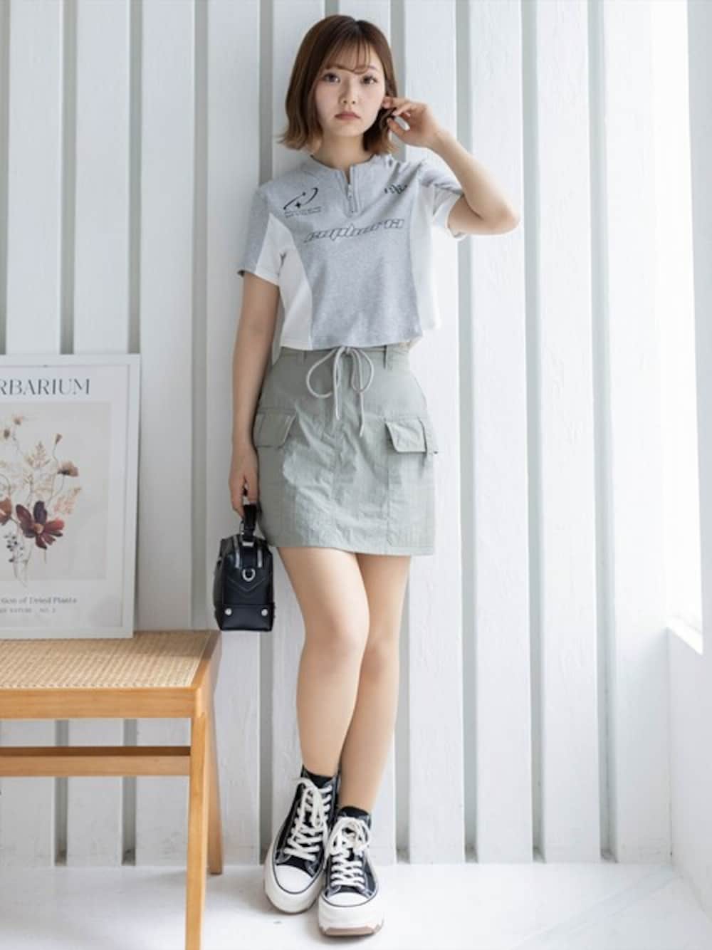 胸元のプリントに目を引かれるデザインのトップスです。コンパクトなシルエットなのでスタイルアップ効果があります♪サイドが配色になっていることで、さらに細見え効果になります!