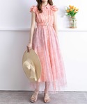 柄の入ったチュールがふんわりと広がるロングワンピース。ベルトが取り外し可能なので、その日の気分次第で着こなしが変えられます◎