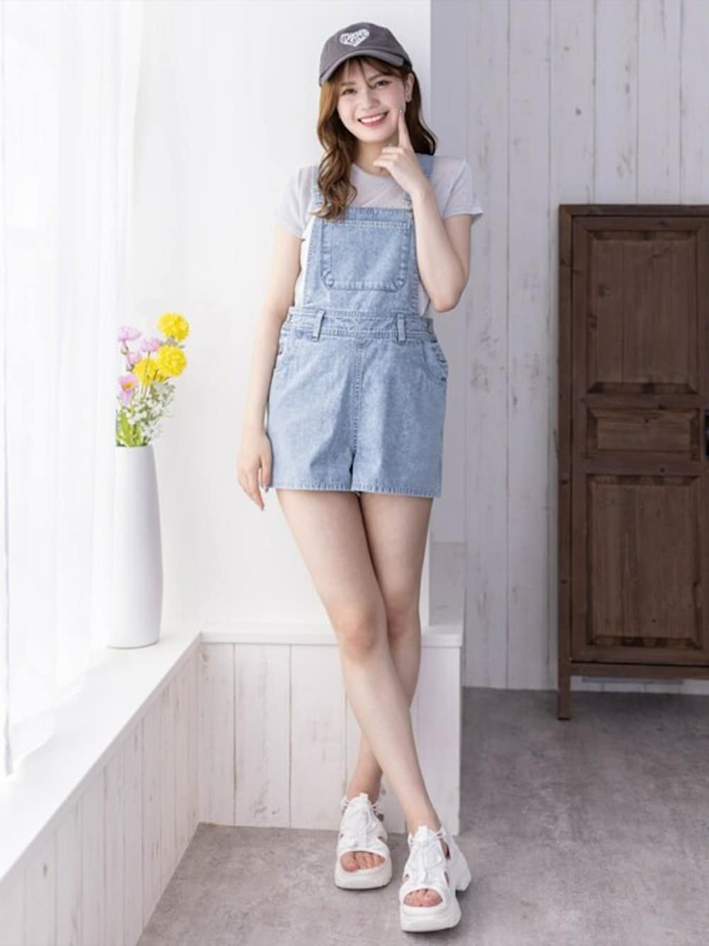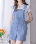 トレンド感のあるデニムミニサロペットです。ハイウエストなデザインなので、美脚効果があります!ウエストはボタンで調節可能になっているので安心できます◎