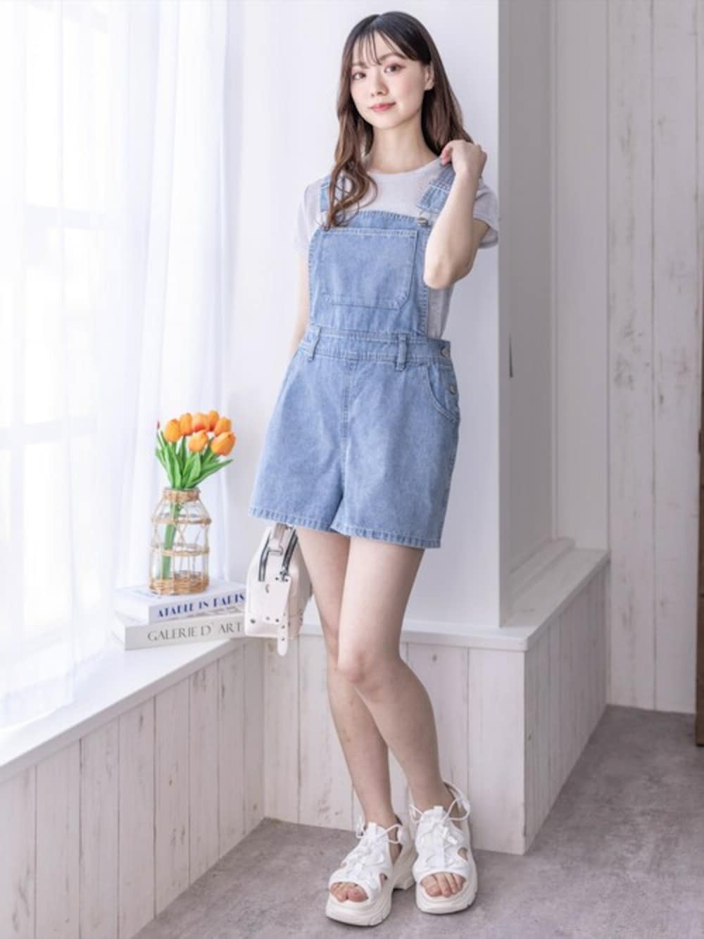 トレンド感のあるデニムミニサロペットです。ハイウエストなデザインなので、美脚効果があります!ウエストはボタンで調節可能になっているので安心できます◎