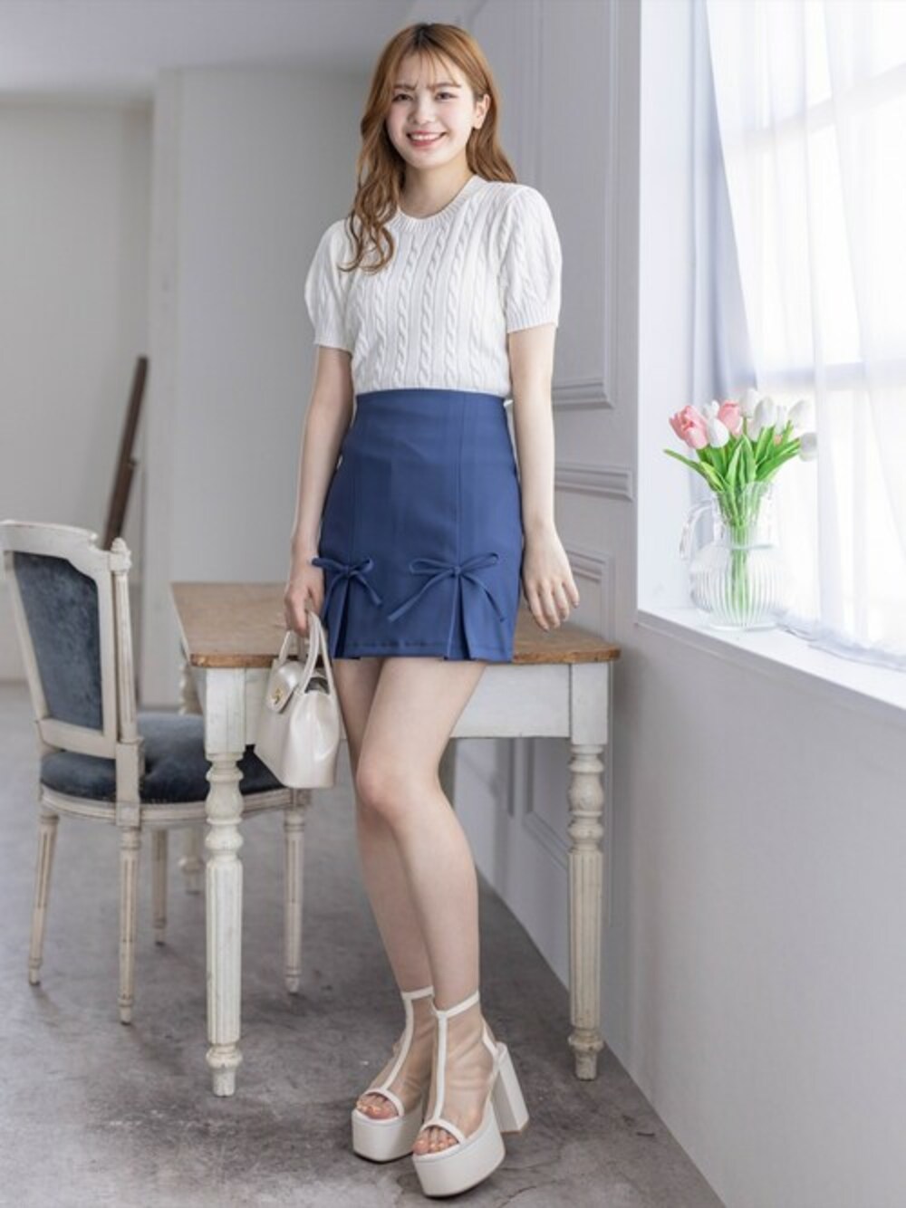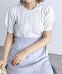 clear(クリア)(clear)のニット/セーター「ケーブル編み半袖パフスリーブニットトップス[オフィスカジュアル 着回し抜群 大人]≪再入荷≫」を使ったコーディネート