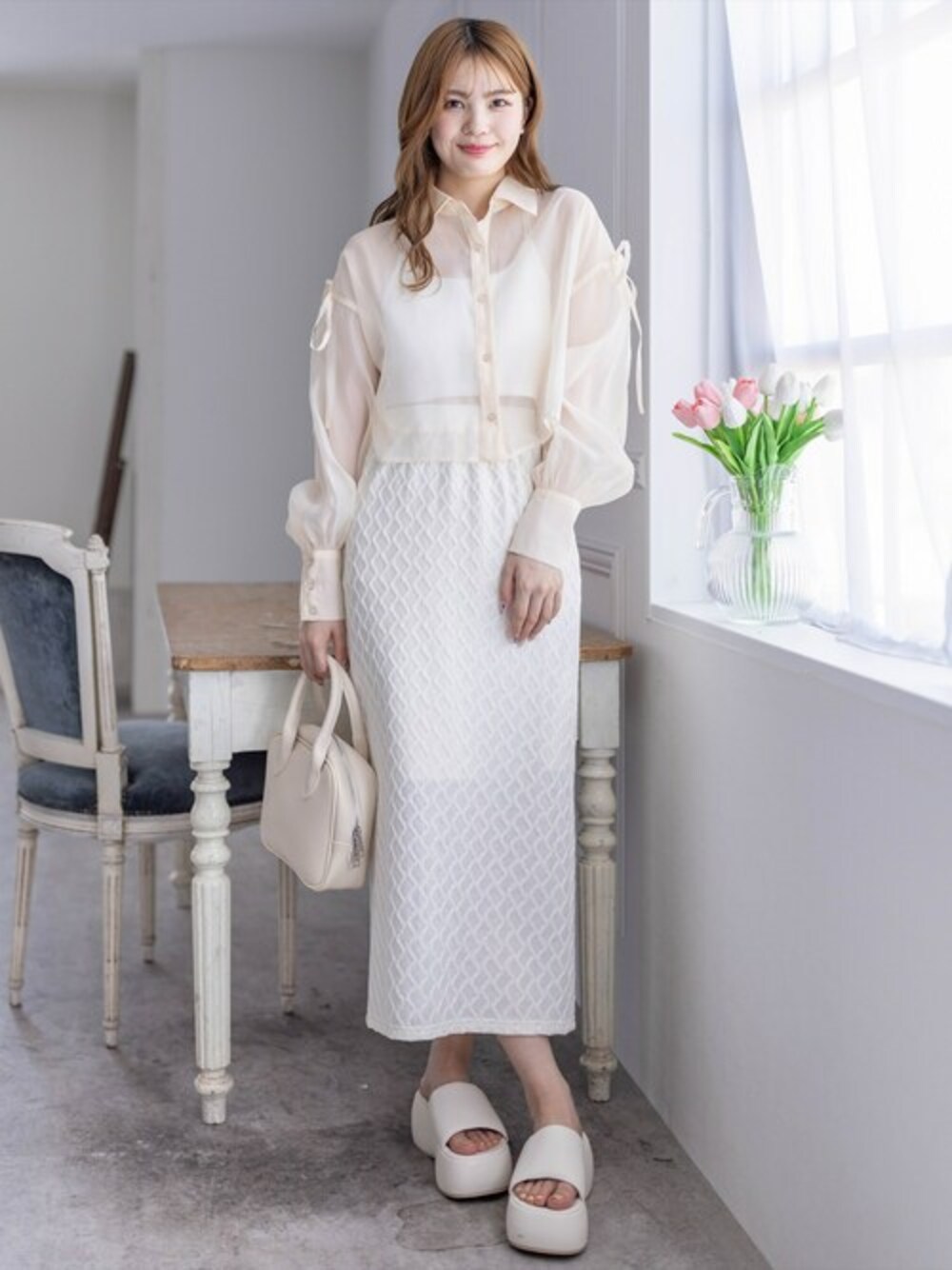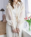 透け感のある生地でヘルシーな肌見せが叶うシアーシャツです。肩のリボンが可愛らしいポイントです!ショート丈なのでハイウエストのボトムスと合わせていただくと、スタイルアップ効果があります♪