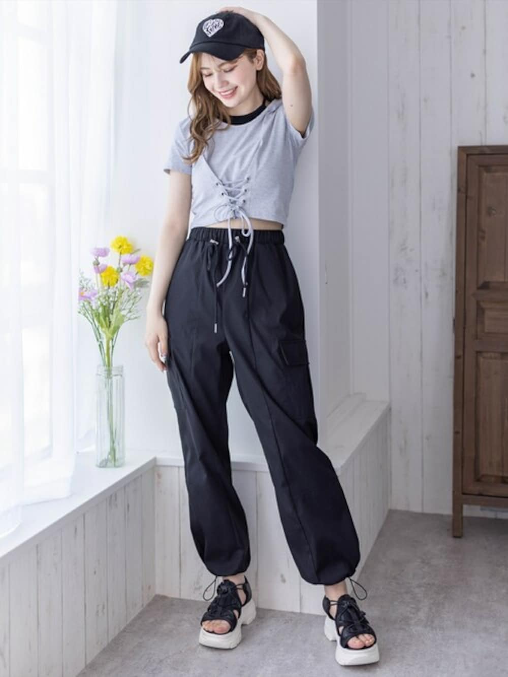 1枚でキャミソールをレイヤードしているように見えるカットソーなので、暑い夏でも涼しげに着ていただけます♪フロントのレースアップもポイントで、オシャレ感がアップします!