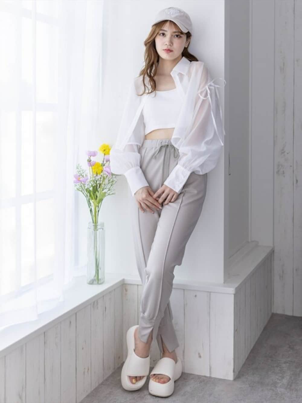 透け感のある生地でヘルシーな肌見せが叶うシアーシャツです。肩のリボンが可愛らしいポイントです!ショート丈なのでハイウエストのボトムスと合わせていただくと、スタイルアップ効果があります♪