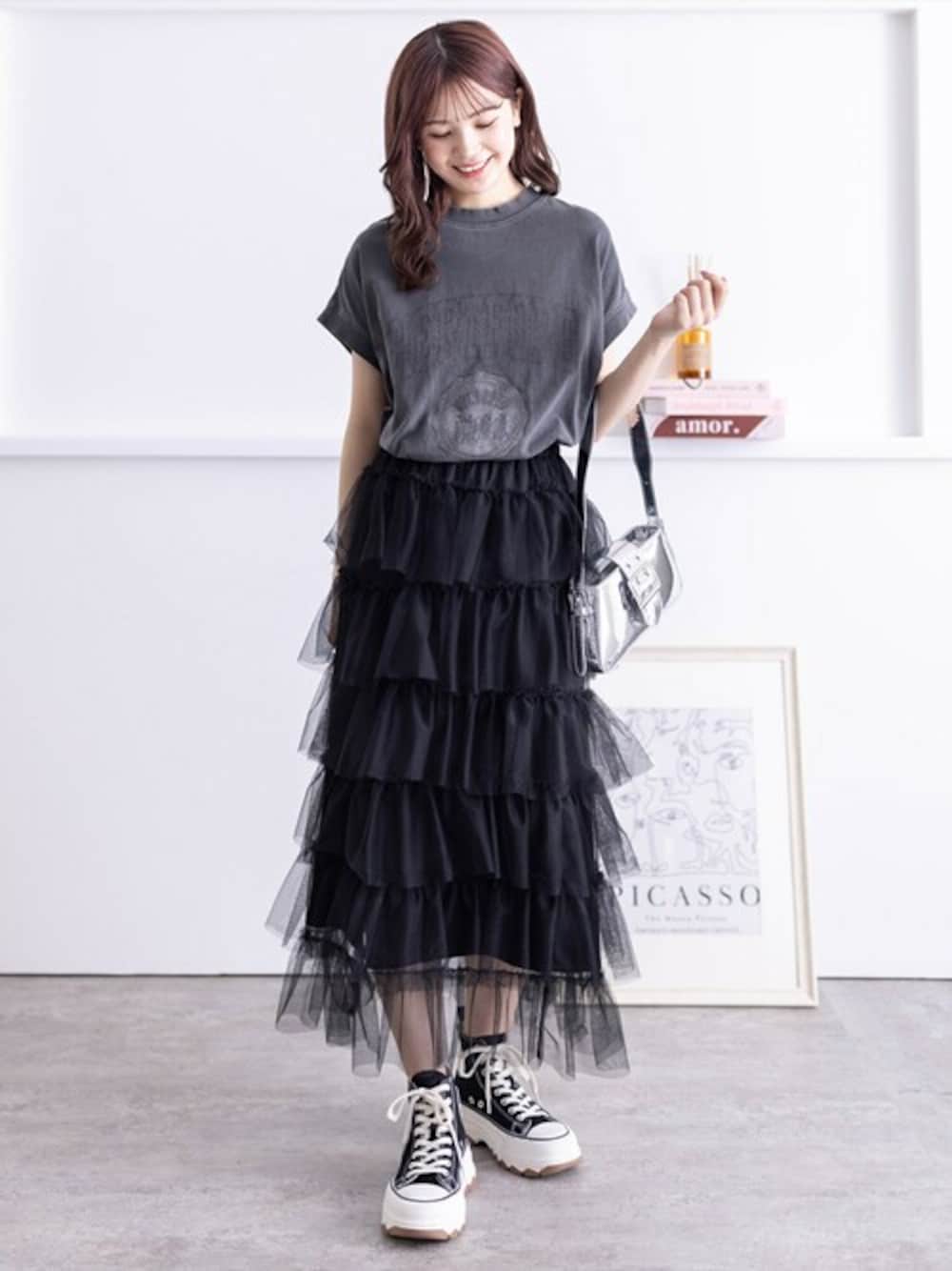 clear(クリア)(clear)のスカート「チュール6段ティアードスカート[低身長用サイズ有 大人 フェミニン]≪再入荷≫」を使ったコーディネート