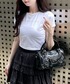 トレンドのラインストーンが胸元にあしらわれているTシャツ。 コンパクトなシルエットなので自然とスタイルアップが叶います♪ どんなアイテムとも相性が良く着回し力抜群です!
